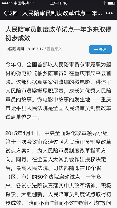 《經濟日報》是全國經濟類報刊中權威性、公信力最強的報紙?!敖袢疹^條”是國內影響力最大的新聞APP,擁有5.3億用戶。本次報道對重慶梁平法院的人民陪審員改革試點工作走向全國有著積極而深遠的影響。而在更早以前,最高人民法院屬下全媒體平臺也對《柚鄉陪審員》以及重慶梁平法院的人民陪審員改革試點工作進行了報道、推廣和肯定。