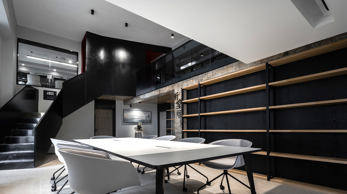 大廳,取名為“聽堂”。這里是日常開會(huì)議事的場所。二樓的框式造型,其設(shè)計(jì)靈感來源于畫幅、取景框等影視元素。穿過大廳,是咖啡吧和衛(wèi)浴空間。