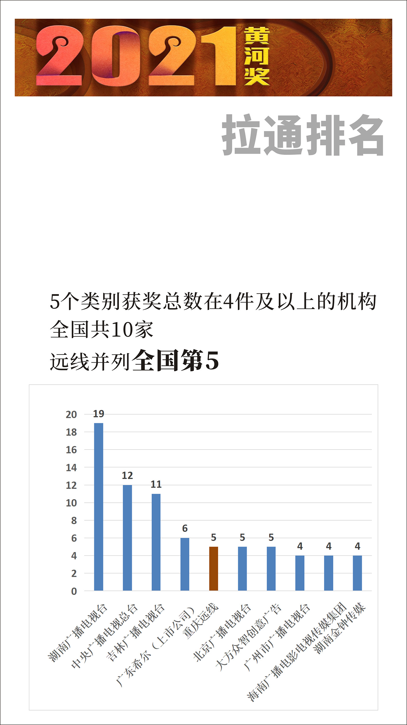 據(jù)統(tǒng)計(jì),今年全國共計(jì)201件作品獲黃河獎(jiǎng),其中視頻類120件,視頻類獲獎(jiǎng)總數(shù)位列前四的機(jī)構(gòu)分別是:湖南廣播電視臺14件(含湖南衛(wèi)視及下屬報(bào)送單位)、吉林廣播電視臺10件(含吉林省廣播電視局)、中央廣播電視總臺8件、我司5件。